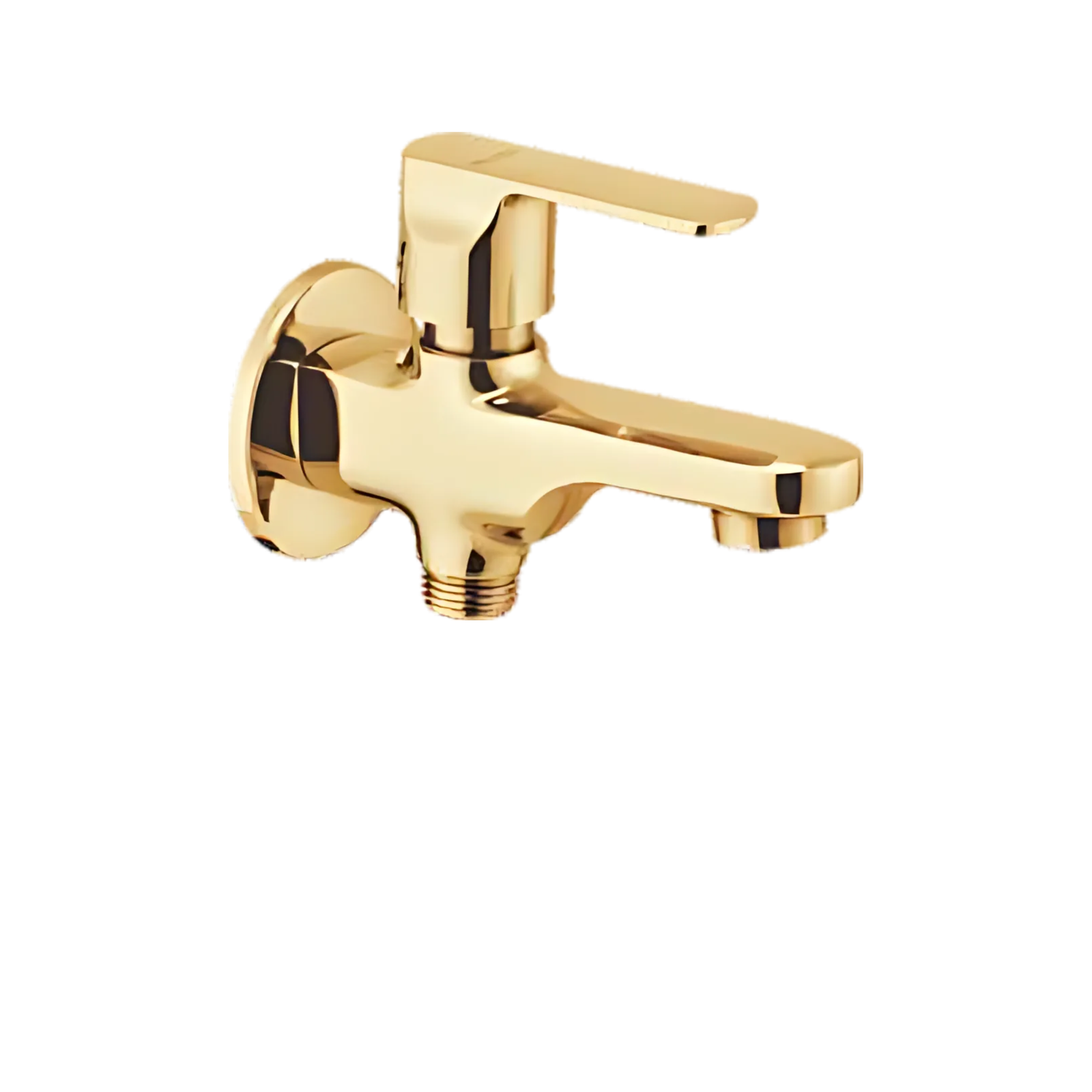 A wall-mounted bib tap in a gold finish, featuring a single lever handle for water control and a threaded outlet for hose connection.