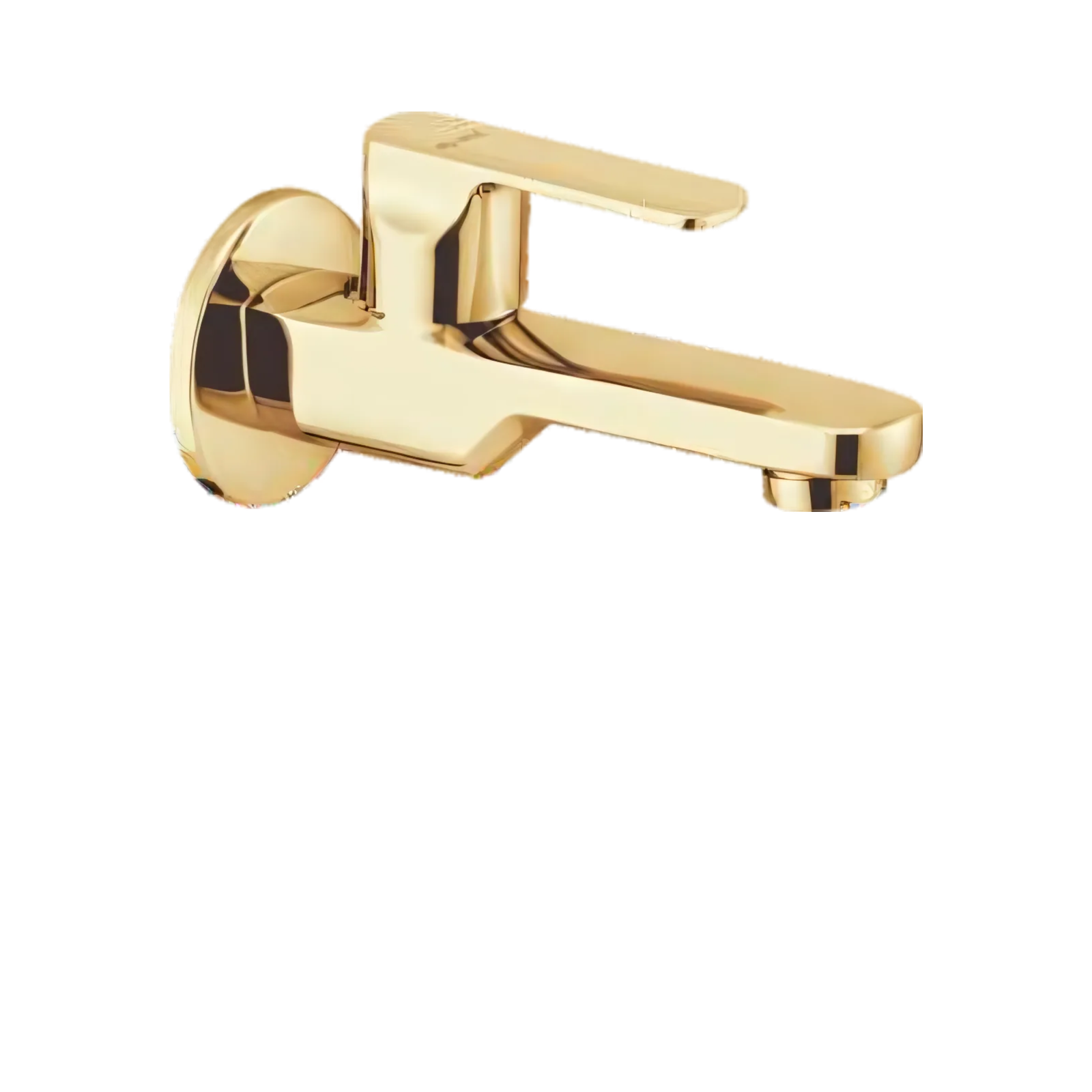 A wall-mounted tap with an extended spout in a gold finish, featuring a single lever handle for water control.