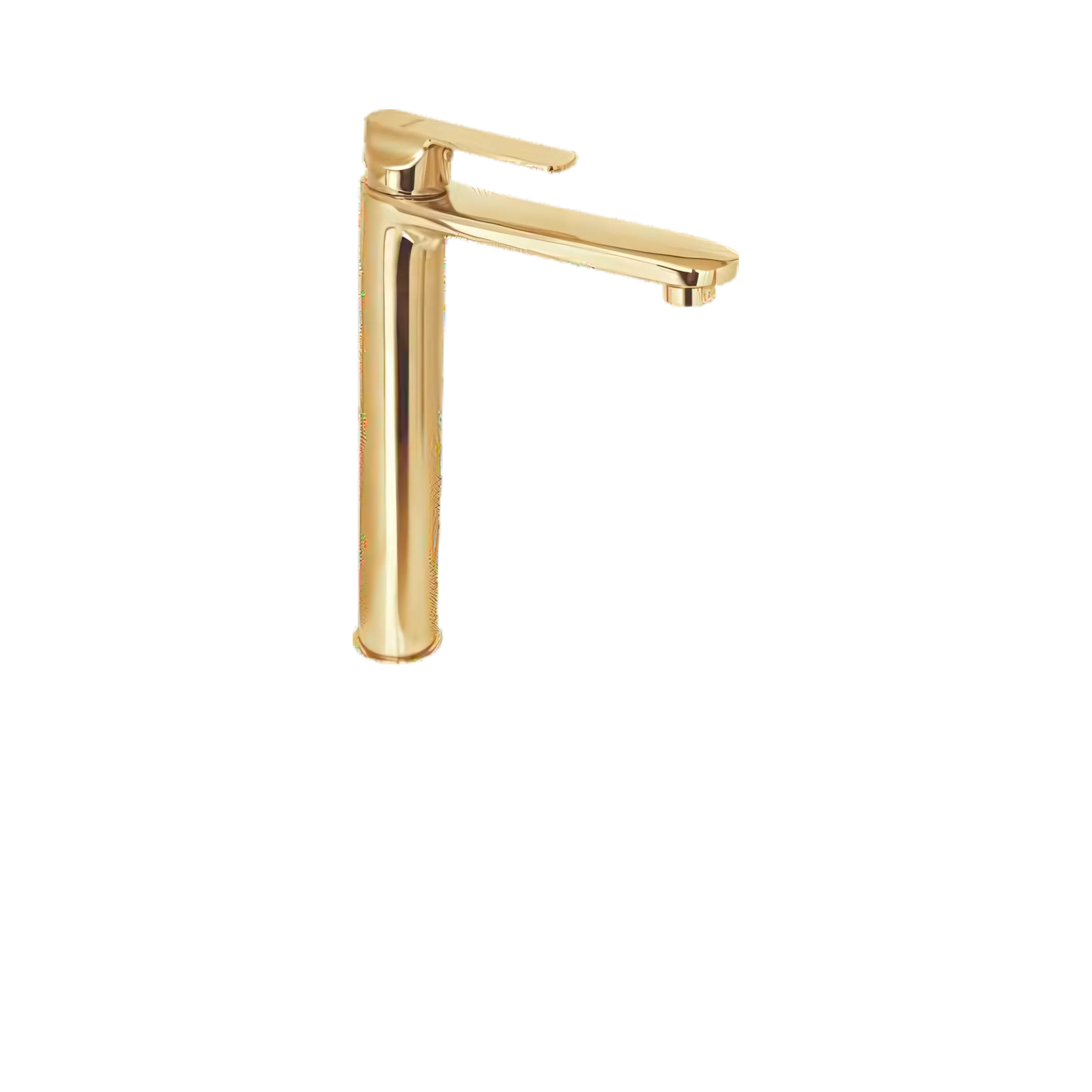 A tall, single-lever basin mixer in a gold finish, featuring a sleek and modern design ideal for countertop basins.